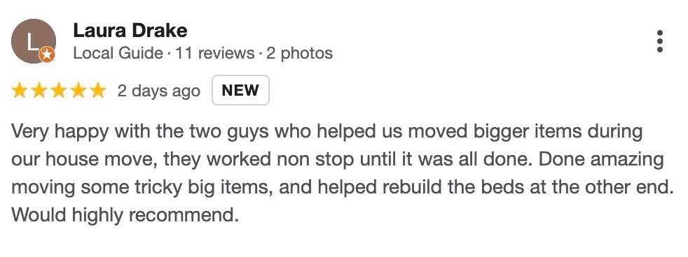 “Very happy with the two guys who helped us moved bigger items during our house move, they worked non stop until it was all done. Done amazing moving some tricky big items, and helped rebuild the beds at the other end. Would highly recommend.”